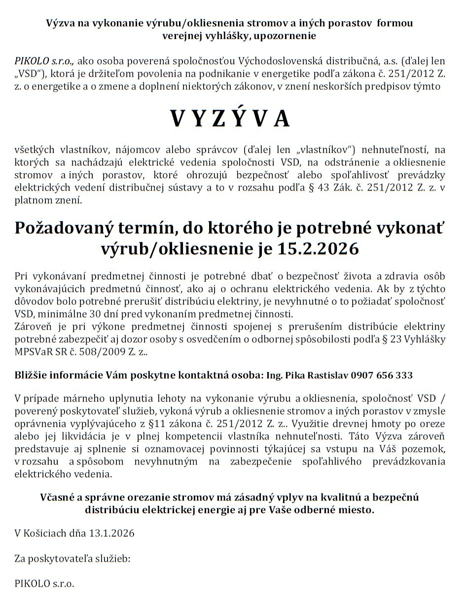 Výzva na vykonanie výrubu/okliesnenia stromov a iných porastov